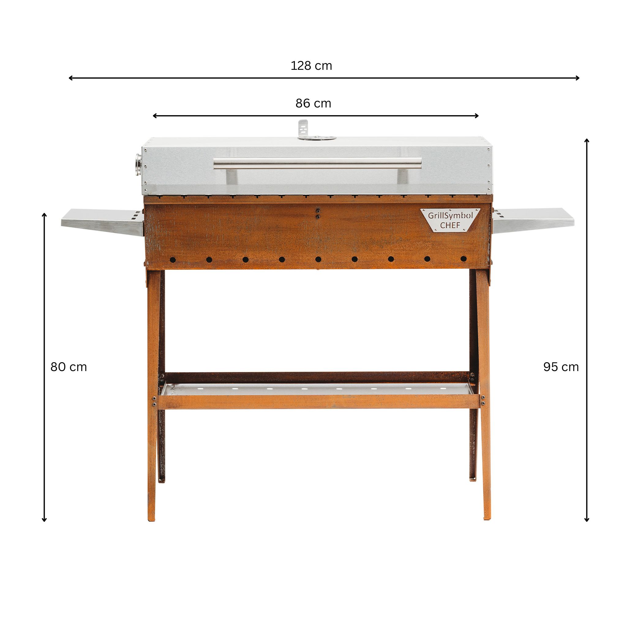 Grillkroppens rödbruna färg matchas med detaljer i rostfritt stål, vilket gör att det inte bara är en väldigt bra grill, utan en grill som sticker ut med sitt imponerande utseende bland annat. Cor-Ten och rostfritt stål är väderbeständiga som material – Chef grill väntar på dig 365 dagar om året under bar himmel och i alla väder!