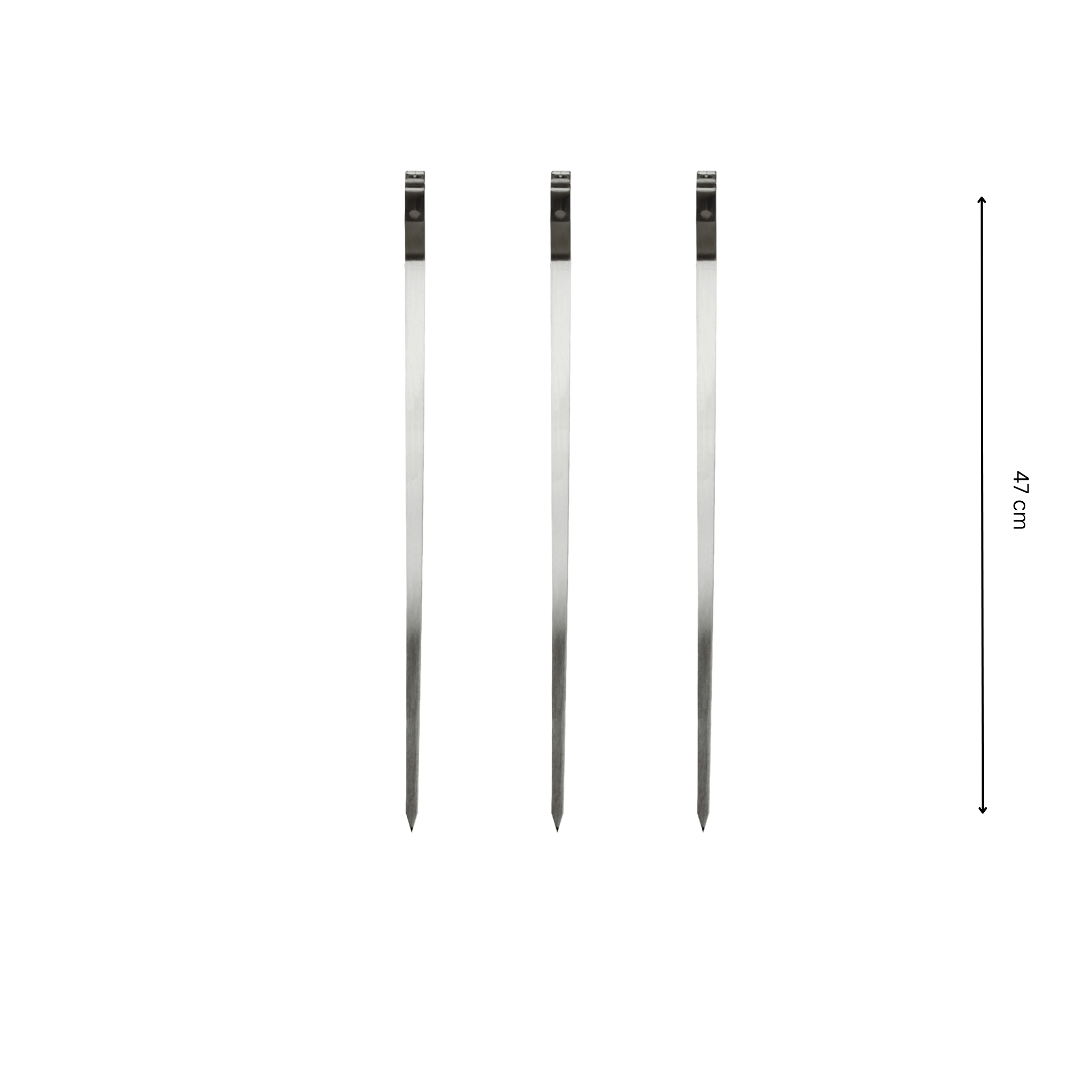 Thick stainless steel skewers.  They are compatible with GrillSymbol Chef grills except for the XXL size. Also suitable for Smoky-Beast smoker grills.